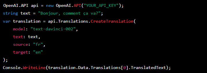 This example uses the OpenAI API to translate the text "Bonjour, comment ça va?" from French to English.
