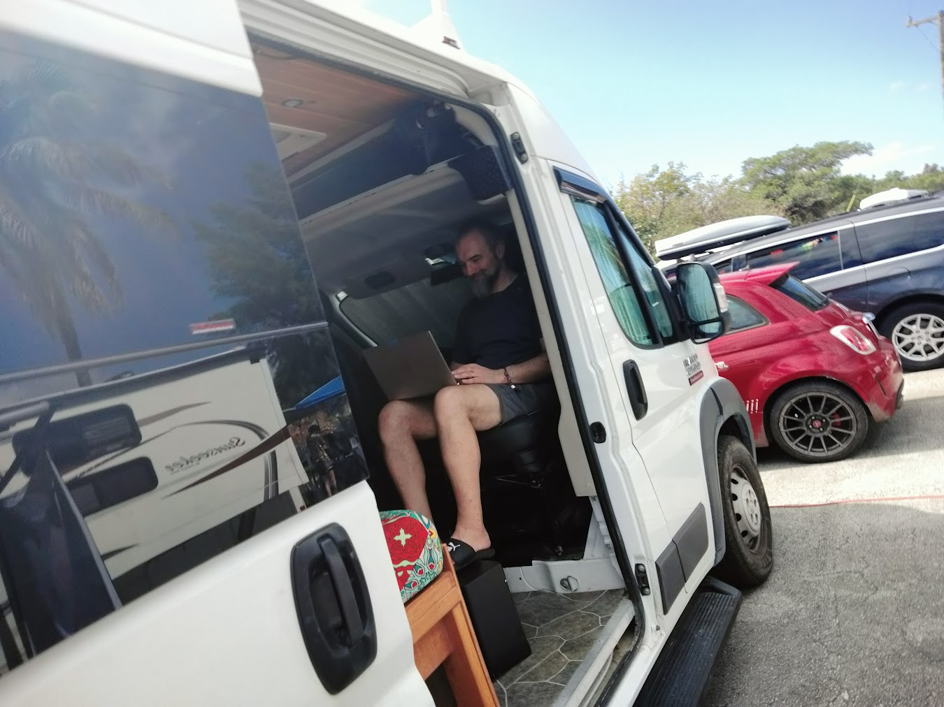 The seat is swiveled around so I can look outside the van and Time is playing in the background. The breeze smells of ocean and palm trees: I feel renewed after two cups of espresso (moka).